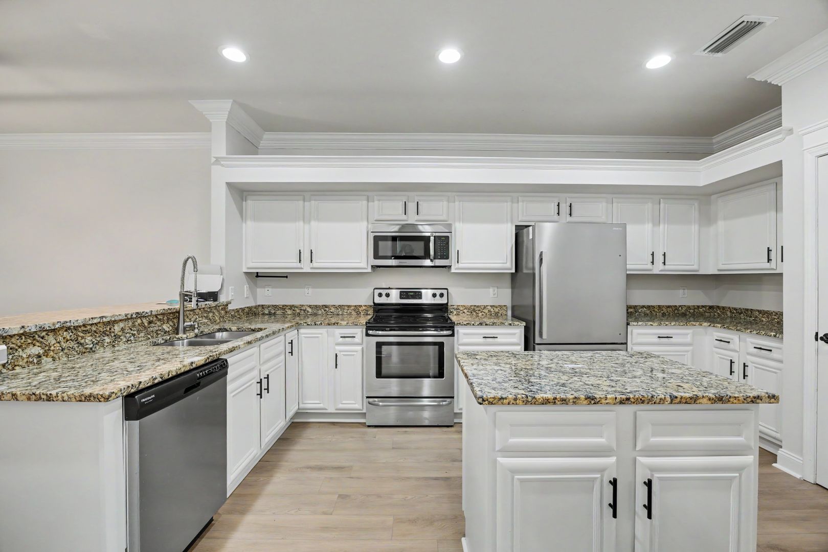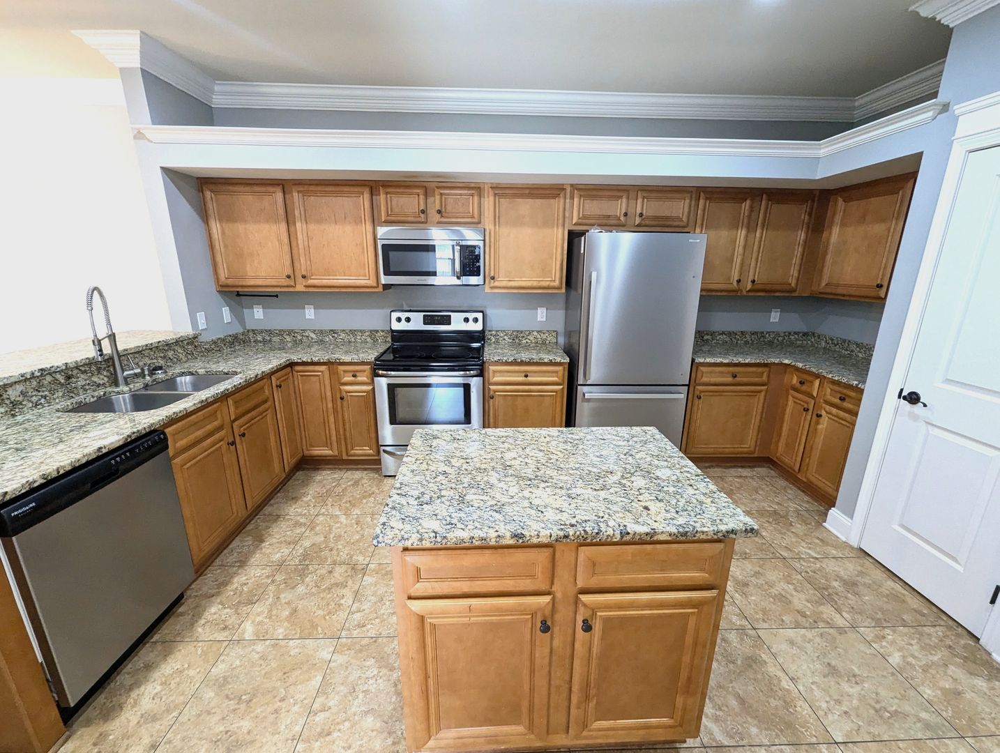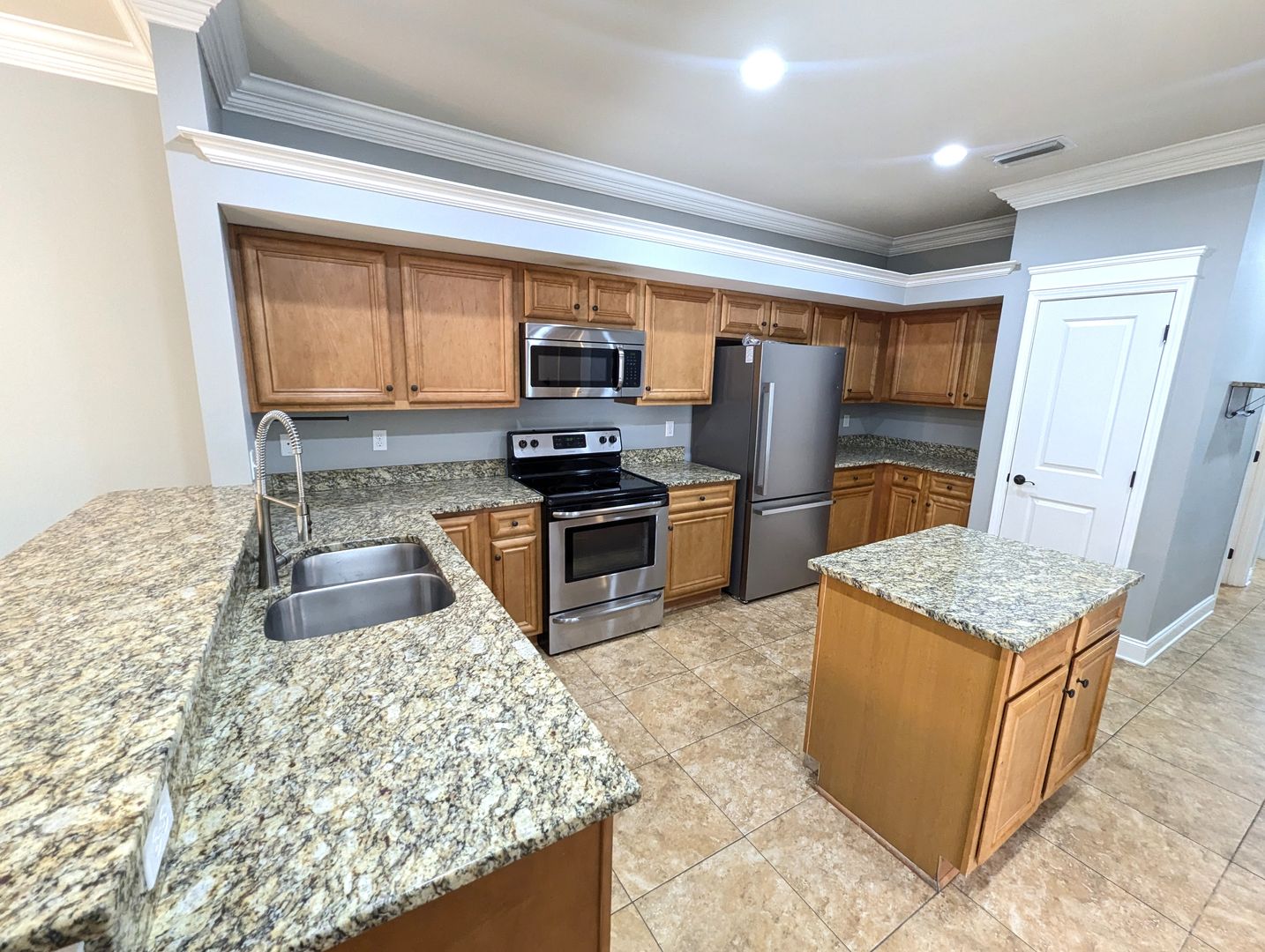 Modern kitchen with stainless steel appliances, large island, extensive cabinet space, and granite countertops galore