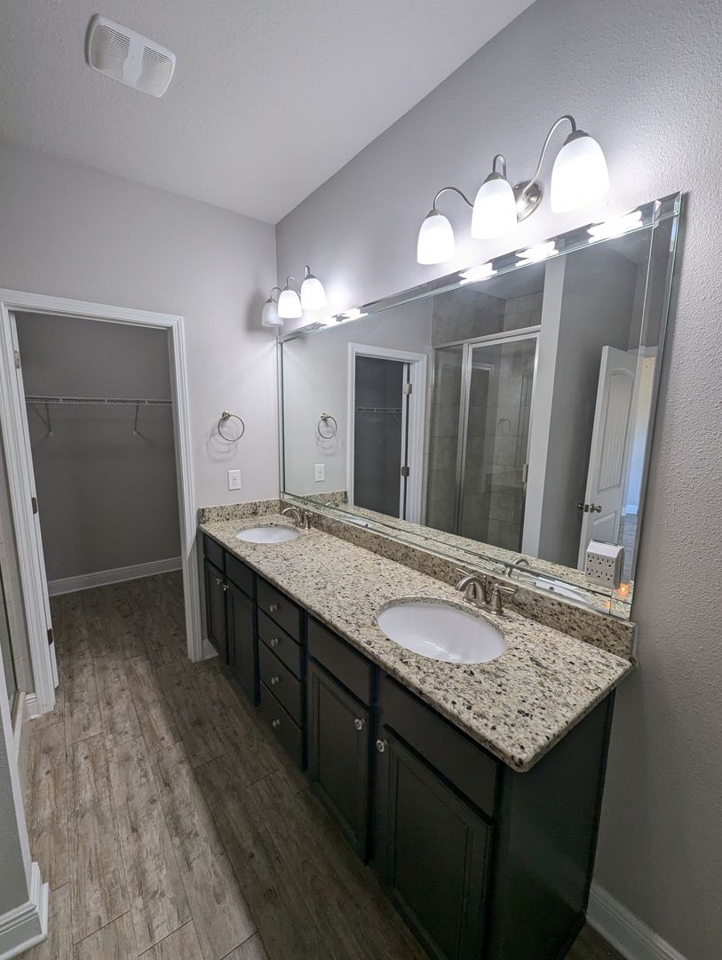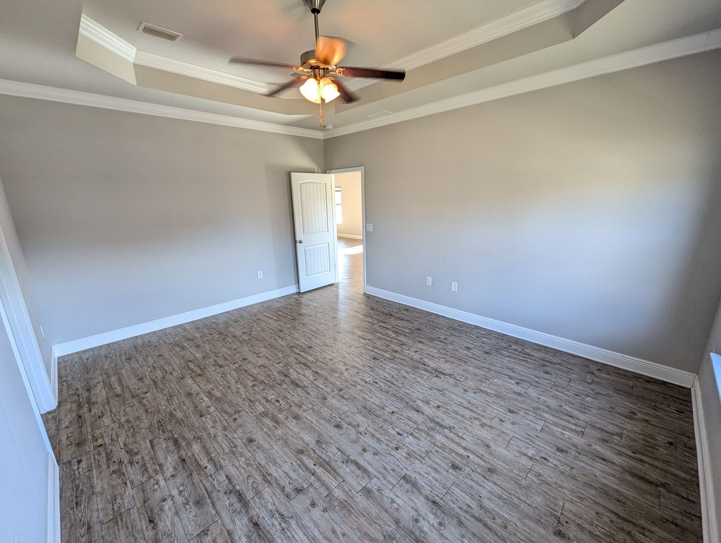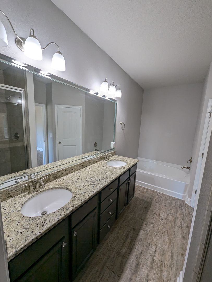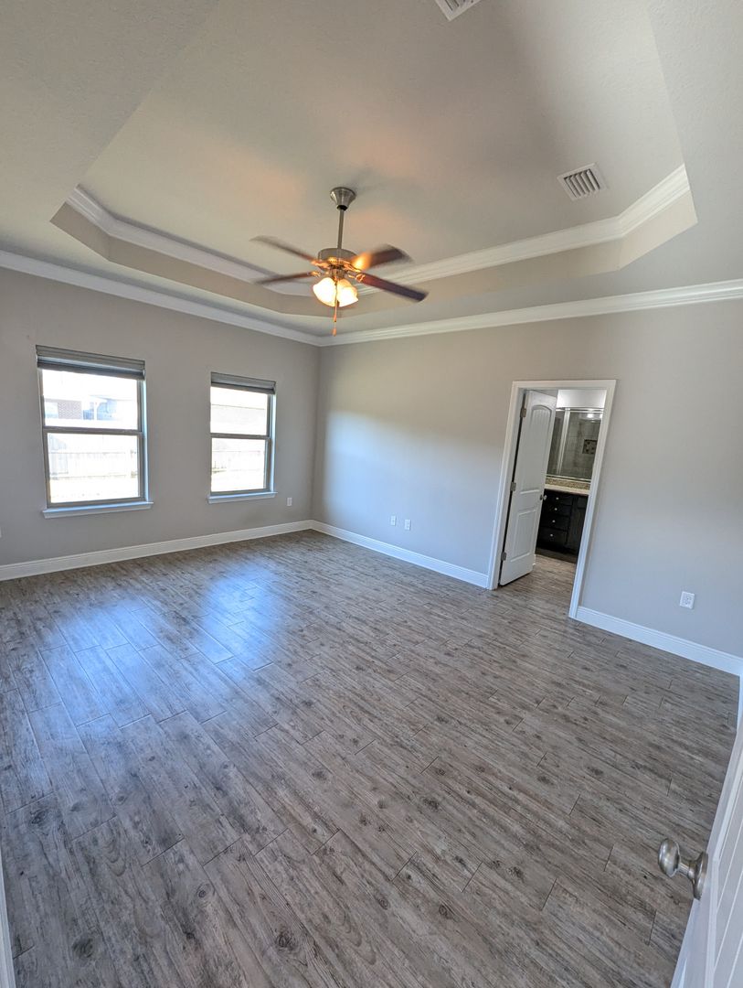 Master Suite: Located at the back of the home, this retreat includes a box trey ceiling with crown molding, ceiling fan, and an en-suite bath with a walk-in closet, raised double vanity with granite countertops, a separate glass-door shower, and a large soaking tub.