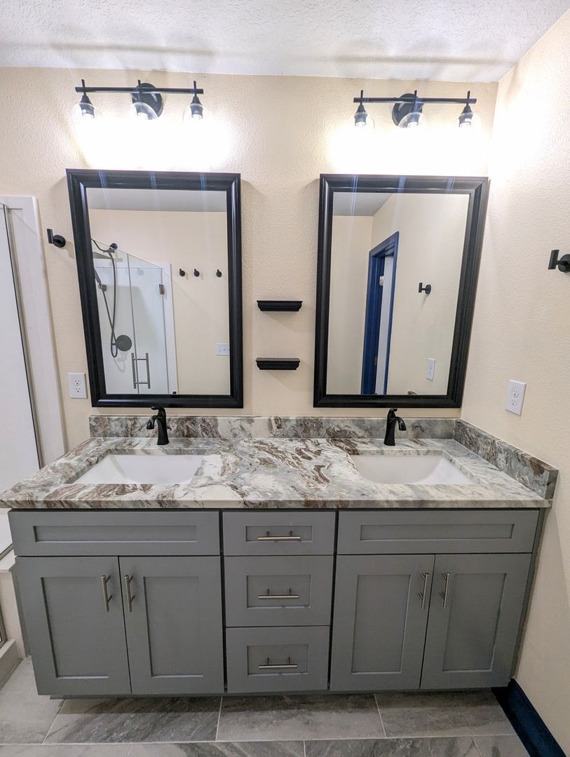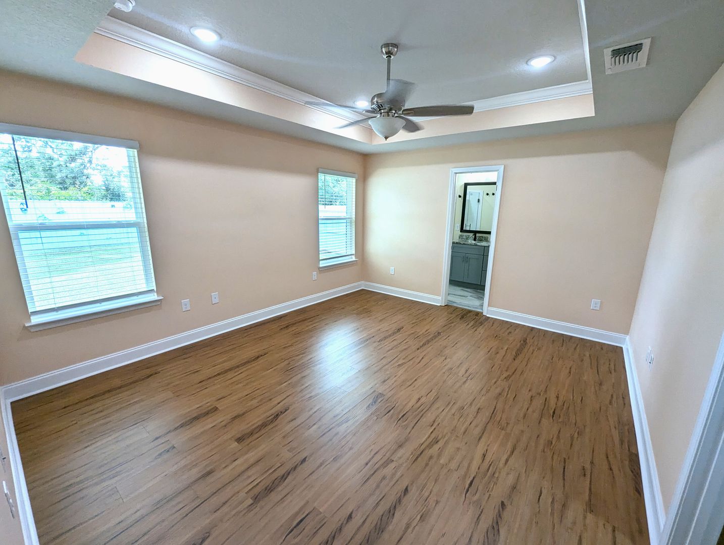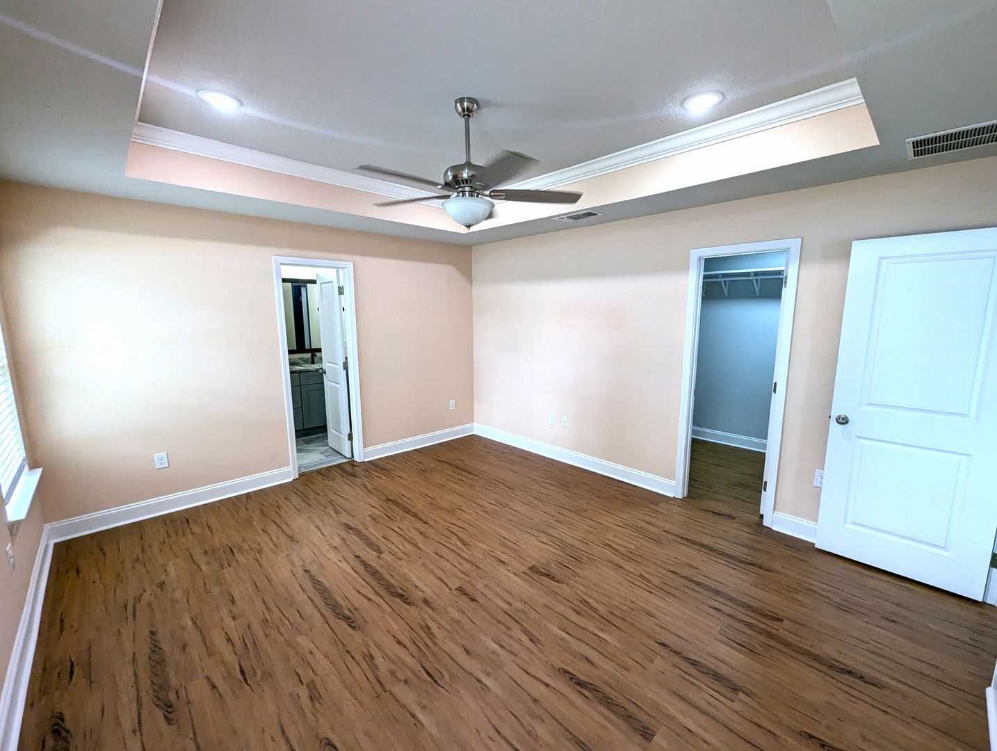 - Spacious primary suite featuring a recessed ceiling, dual vanities, a tiled walk-in shower with bench, and an oversized walk-in closet
