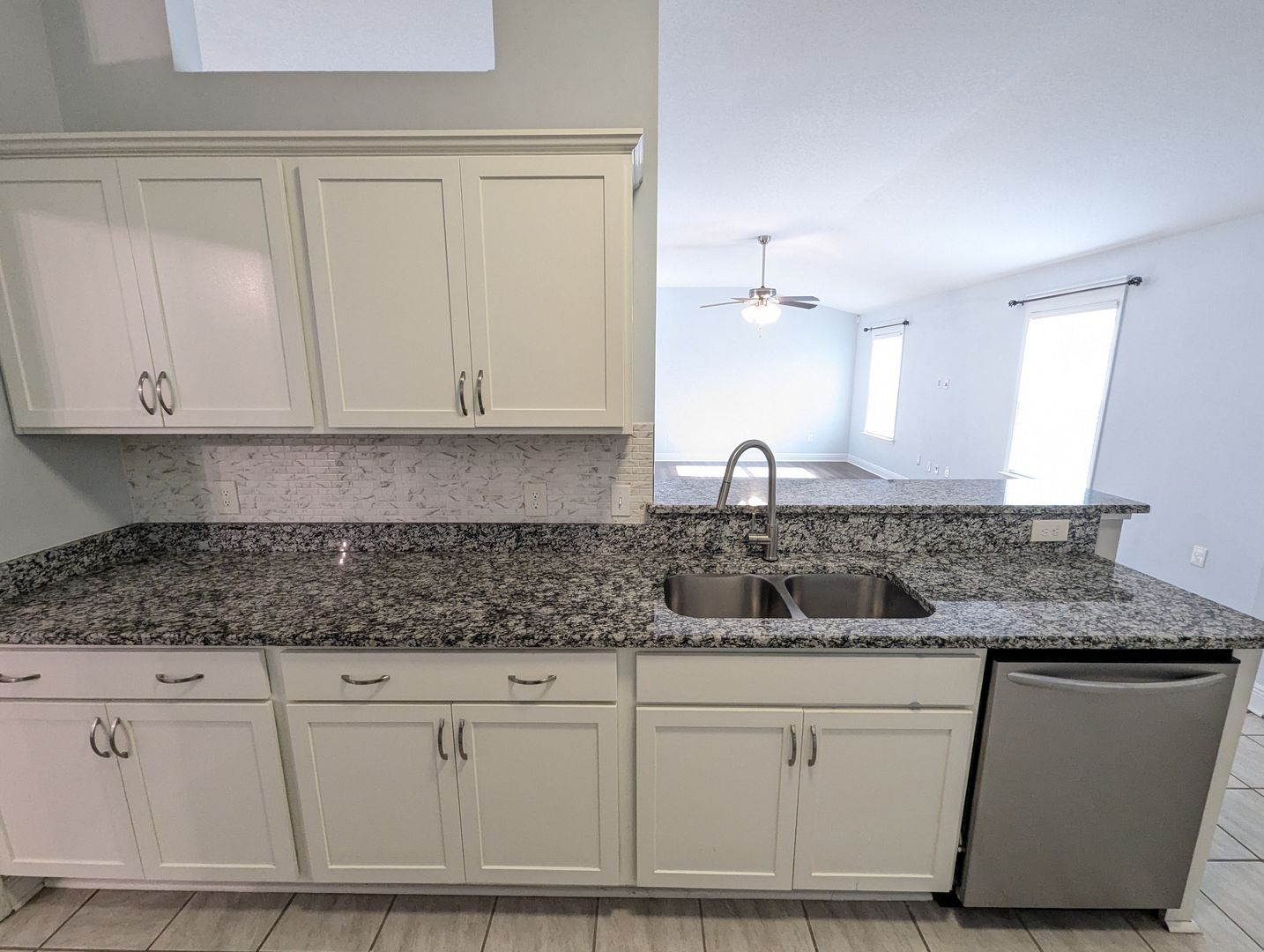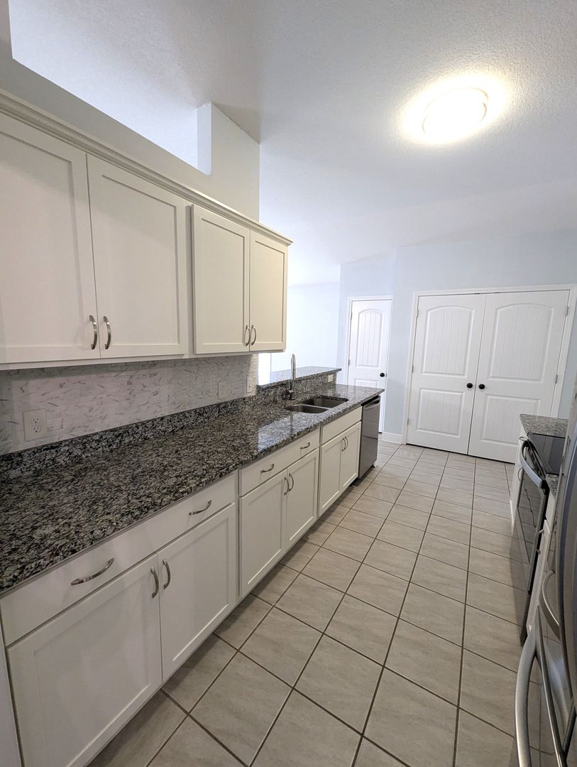 The spacious living room seamlessly connects to the kitchen and dining area, making it the heart of the home. The kitchen features stainless steel appliances, granite countertops, and a beautiful backsplash that adds a modern touch.