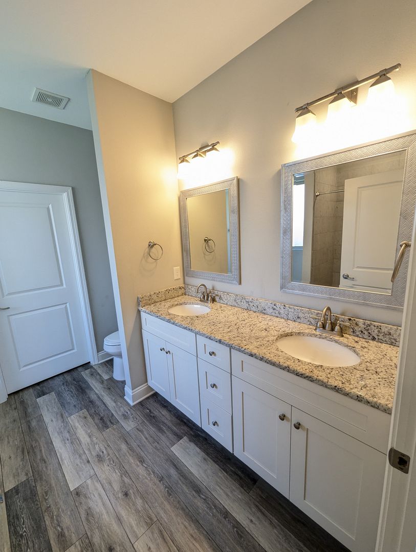 Master bath with a large shower, garden tub, double granite vanity, tile floors, and a large walk-in closet